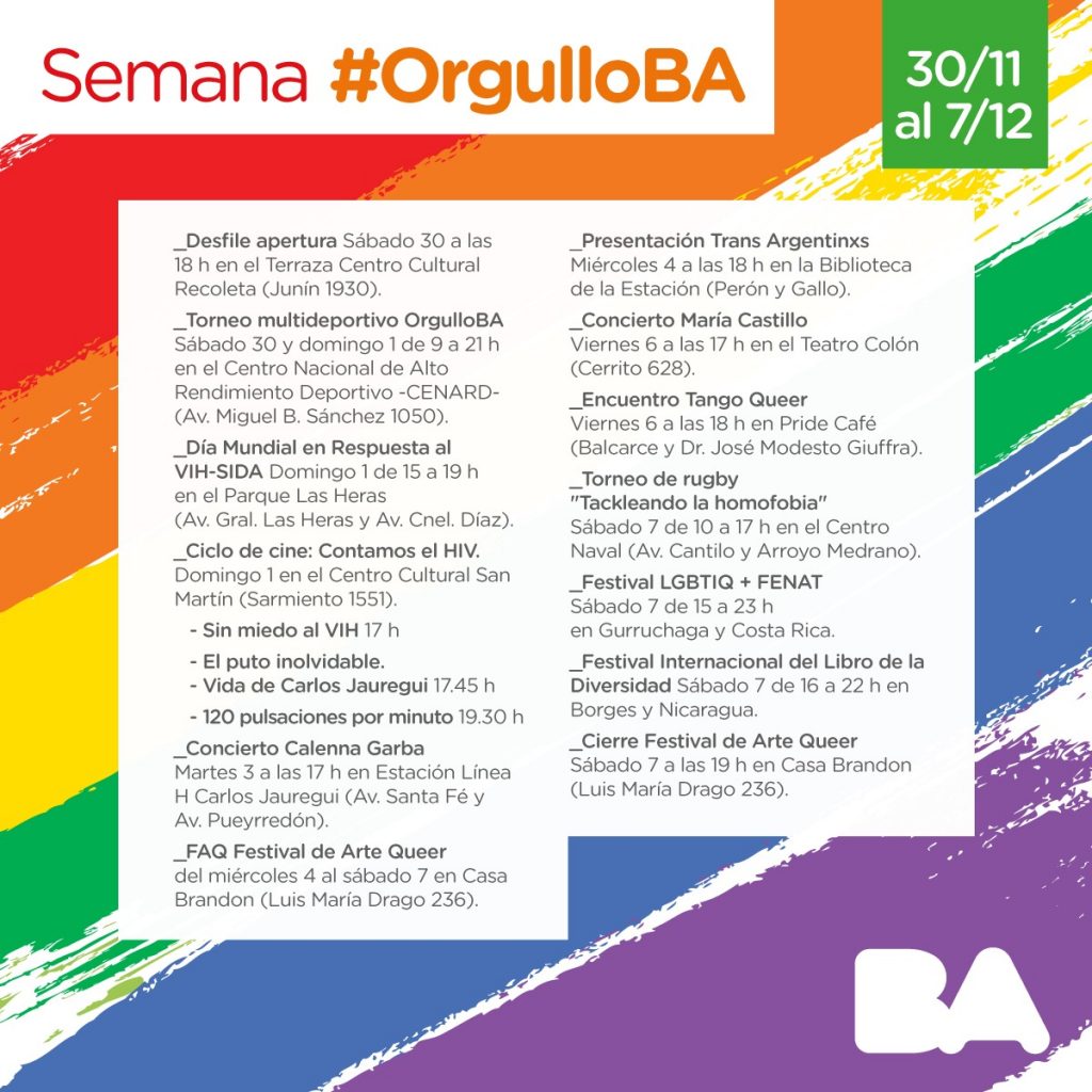 Desde el 30 de noviembre hasta el 7 de diciembre, se festejará la semana del Orgullo BA en la ciudad. Se hace para promover los derechos del colectivo LGBTIQ+. Diferentes expresiones culturales, artísticas, educativas y también deportivas. Acá te pasamos el cronograma de actividades para que las puedas aprovechar y no te pierdas ninguna.